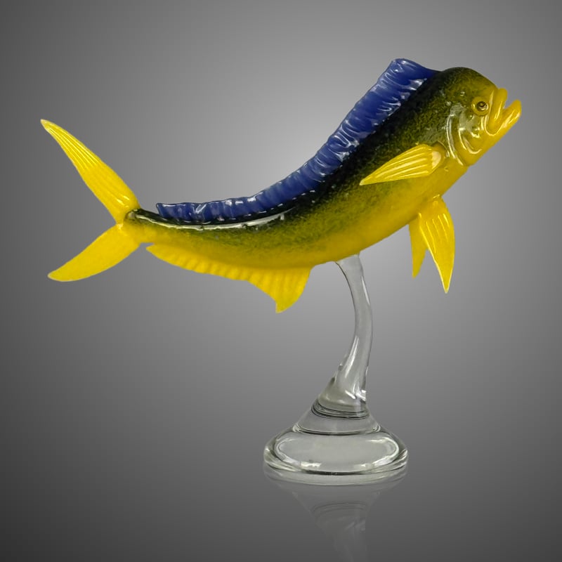 Mahimahi - Coryphaena hippurus - 5.5" x 7" x 2" - Also called the "dolphinfish" or "Dorado", this is one of the most beautiful game fish in the ocean. Sculpted freehand in borosilicate glass and mounted on a clear glass stand.