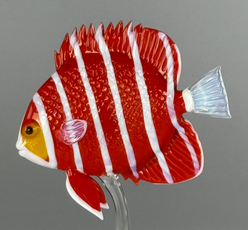Peppermint Angelfish - Centropyge boylei - This beautiful little fish is found in the central South Pacific Ocean and is native to the Cook Islands. It is characterized by its brilliant orange-red and white vertical bands. This one is slightly larger than life size. Created out of borosilicate glass by Robert Mickelsen. About 5" x 4" x 2"